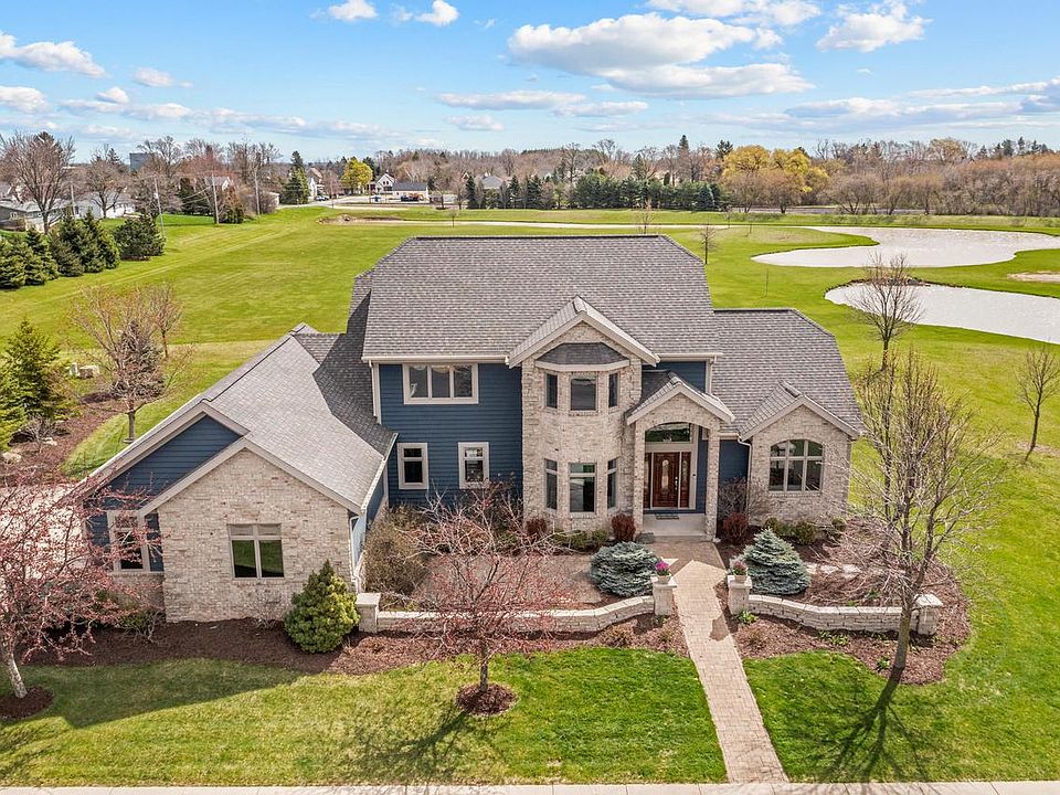 Simply Stunning, this exquisite 4BD, 2.5BA home is on almost a 1/2 acre & has impressive views of the village ponds, common green space & walking paths. From the moment you step inside your eyes are drawn to the soaring vaulted ceiling & walls of glass that overlook the beautiful backyard & paver patio w/ firepit & built in Tiki Torches. You'll love the bright & cheery kitchen that has custom cabinetry, granite counters & a wet bar. The 2-sided gas FP gives ambiance to both the dining area & the great room. You'll appreciate the main floor primary BD w/ dual walk-in closets & a huge ensuite. Den/Office on main floor could serve as a 5th BD. Huge 3+ car insulated garage has an entrance to the basement. Main floor laundry is a perk. Top Rated School District is a HUGE Plus. Welcome Home!