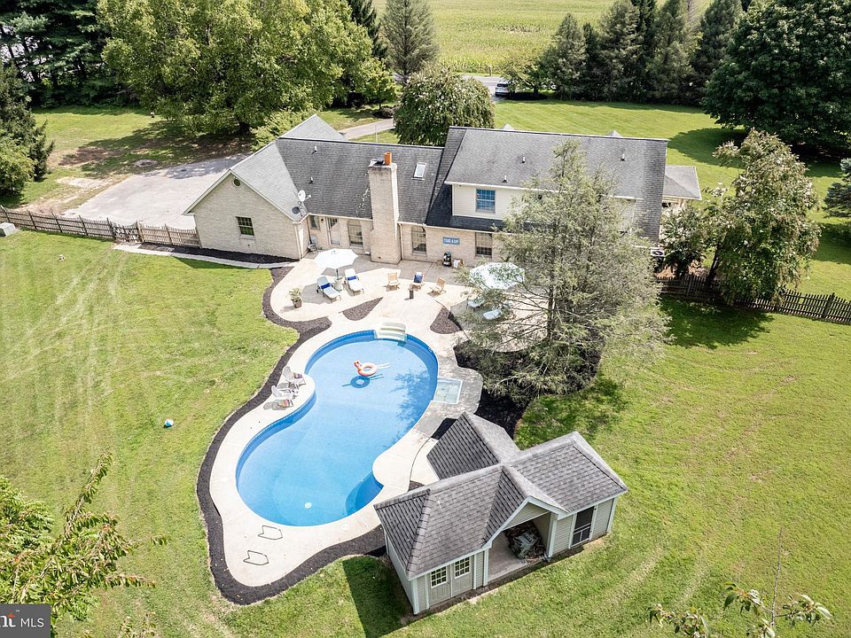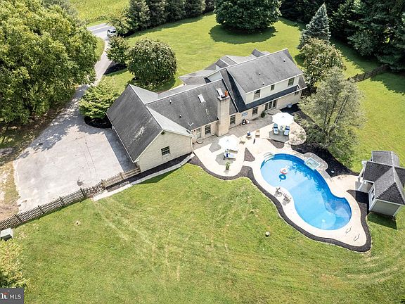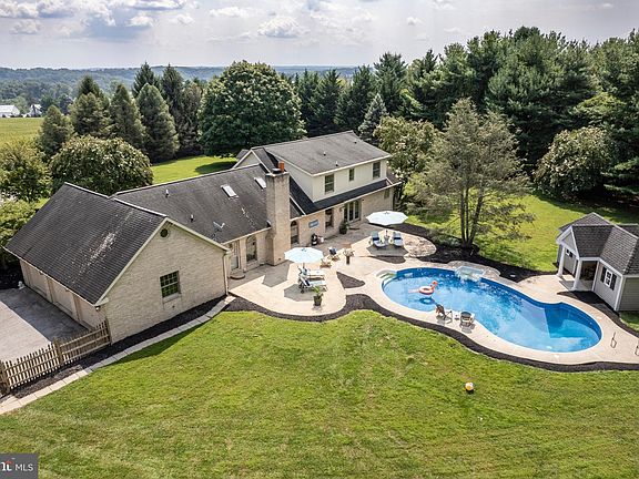 Welcome to your dream home, nestled on 3.5 acres of serene privacy in the heart of Hampstead, Maryland. This luxury property is a true oasis, featuring a stunning pool that creates a tranquil retreat in your own backyard. The home boasts 4 spacious bedrooms and 4.5 baths, including a main-level primary suite with direct access to the pool area, and a secondary primary suite on the upper level, perfect for guests. Step inside from the expansive covered front porch, leading to a foyer flanked by formal dining and living rooms, ideal for entertaining. The interior showcases rich hardwood flooring and a neutral color palette throughout, providing a warm and inviting atmosphere. The heart of the home is the upgraded kitchen, featuring gleaming granite countertops, a large center island, a breakfast area, top-of-the-line appliances, and stylish pendant lighting. Adjacent to the kitchen, the family room offers a cozy space to relax, with a vaulted ceiling and a stunning stone fireplace. The main-level primary suite is a private sanctuary, complete with two generous owner's closets and an attached bath featuring double sink vanities, a corner soaking tub, and a separate shower. The upper-level primary suite is equally impressive, offering a spacious bath for ultimate comfort. The fully finished basement is an entertainer's paradise, with a wet bar and island overlooking a billiards area and family room, along with a full bath. A separate flex space provides room for an exercise area, storage, and more. Additional large workshop is also present on this level. Step outside to your peaceful oasis, where the patio overlooks the rear yard and pool, recently updated with a brand-new liner and new pump. The pool area is perfect for hosting summer gatherings, complete with a pool storage shed and a serene, wooded view that enhances the sense of tranquility. Attached side loading, 3-car garage equips you with plenty of additional storage. This prime location in Hampstead offers both luxury and privacy, with numerous upgrades that cater to a sophisticated lifestyle. Make this exquisite property your forever home.
