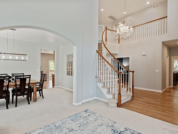 Spectacular home on a private lot backing open space in Rock Creek Ranch! No detail has been overlooked. Grand entry with vaulted ceilings, new custom paint, new custom lighting, refinished hardwood floors & more! Upon entering the foyer, you are greeted by an all new spectacular statement chandelier & spiral staircase. To the left you will find the living & dining rooms with new paint, new window treatments & new lighting. Continuing through there is a fabulous kitchen w/new top of the line appliances, center island, 5 burner gas cooktop, double ovens, separate walk in pantry & kitchen nook overlooking the magnificent backyard. Family room boasts new paint, new ceiling fan, new window treatments & views to the backyard. There is a main floor office w/french door entry that could be converted to an additional bedroom has access to the 3/4 bath. The large separate laundry room completes the main floor. Upstairs the owner's suite is perfect at the end of the day to relax in! New paint, new ceiling fan & en suite 5 piece owner's bath w/sliding barn door. Huge walk in closet, new paint, new fixtures & new seamless glass shower enclosure. There are 2 bedrooms that share a Jack-n-Jill bath and the 4th bedroom has it's own private full bath & walk in closet. The finished basement completes this home with a rec room & wet bar, 5th bedroom, exercise space/2nd office & another 3/4 bath. Too many great details to list, see this home today!