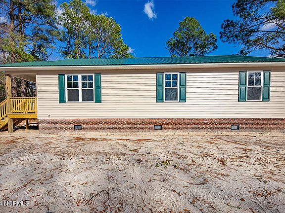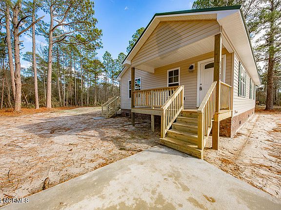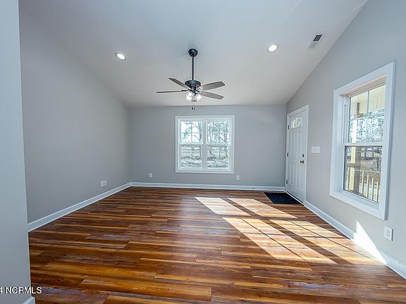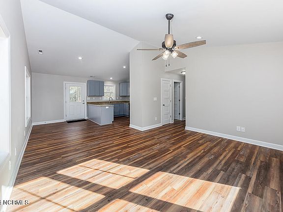 Nestled down a tranquil private road, this newly constructed ranch-style home at 520 E NC 55 Hwy in New Bern, NC, offers the perfect blend of modern living and natural serenity. Situated on a generously sized 0.46-acre lot, the property is surrounded by mature trees, ensuring privacy and a picturesque setting. A covered wood deck leads to your front door that opens into a spacious, open-plan interior. Inside, the home boasts vaulted ceilings, recessed lighting, and LVP flooring throughout, creating an airy and inviting atmosphere. Ample natural light floods the space through large windows, highlighting the home's contemporary design.