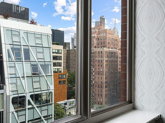 This alcove studio lives like a designer suite in a five-star hotel — sleek, luminous, and unapologetically chic. Three oversized windows showcase sweeping northern views of the city skyline and the High Line, while walnut herringbone floors and soaring ceilings set a tone of modern glamour.