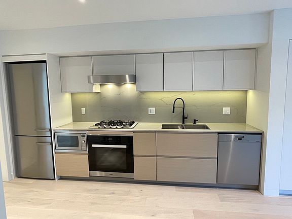 -*Modern Kitchen: Outfitted with stainless steel appliances, including a fridge, gas cooktop, wall oven, dishwasher, microwave, and hood fan.