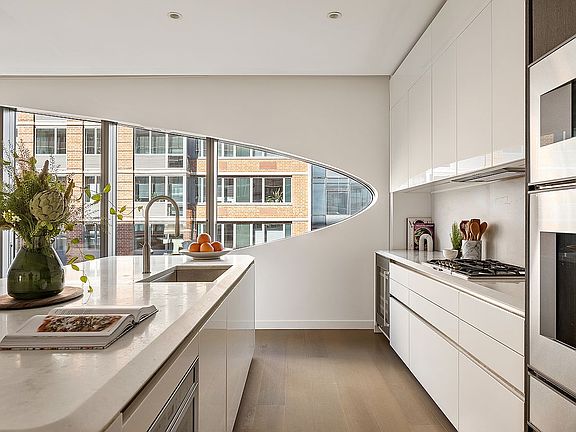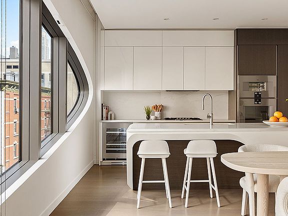Upon entering the apartment, a dramatic and sun-flooded 32 × 21’ great room with seven sculptural windows facing north onto 28th Street sets the tone of this incredibly artful property. The open kitchen was designed in collaboration with Zaha Hadid and Boffi and is outfitted with a sleek eat-in island, white marble countertops and a suite of fully-integrated Gaggenau appliances.