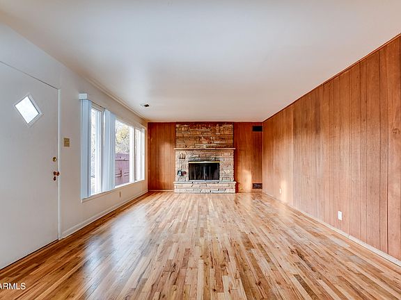 relaxing on chilly Prescott evenings. The open floor plan seamlessly connects the living room to the dining area and kitchen, creating a functional and welcoming space for entertaining. The kitchen boasts