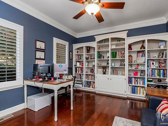 Really nice 2 story home with all beds on the upper level! Quiet cul-de-sac street. 2 story foyer! Office with lots of built-in shelving and french doors to close for privacy. Kitchen features black appliances -- frig, microwave, gas stove, dishwasher! Nice bar to sit up to or enjoy the kitchen dining area for family meal time. Living room has built-in next to the cozy gas fireplace. Laundry on the main along with the half bath -- clothes washer & dryer stay. Upper level features a large master suite with jetted tub, large walk-in shower and nice sized closet. Bedrooms 2 & 3 are a good size too! Basement is finished with large family room and full bath! Brick patio and large backyard with lots of trees! HOA covers lawn mowing, sprinkler system, and snow removal! Close to K-10/I-70 for commuters. Rock Chalk Park, restaurants & shopping are within minutes! Call to see today!!!