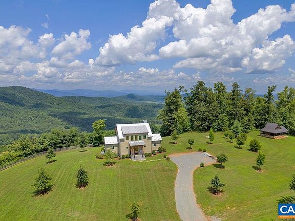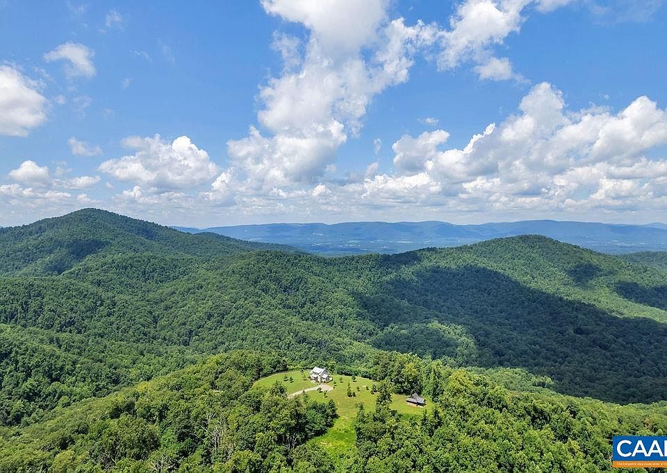 This is a remarkable mountaintop estate of 377 acres, featuring a stunning six-year-old cabin with one-of-a-kind views, a timber-frame cottage made from 200-year-old materials, a pond, a campsite, trails, and incredible tracts of untouched forest. The four-bedroom residence (2,697 sf), with high-end materials that are built to last (metal roof, copper gutters, fiber cement siding, pine paneling, stone fireplaces, slate, hardwood, and concrete flooring, etc.), is as impressive as its surroundings. It is also understated, simplistic in its design and practical and efficient in its layout. The bluestone veranda, with dramatic views to the north and west, steals the show. Located 20 minutes south of Charlottesville, this completely private retreat consists of four contiguous parcels. The second (212.19 ac.), known as "Dancing Creek," includes the three-bedroom timber-frame cottage, large garage, trails, streams, and more. The third (31.69 ac.) includes a log cabin, suitable for guests or a property manager. The fourth (21.04 ac.) is unimproved. The entire offering includes miles of walking and riding trails, is made up primarily of hardwood forests, and is surrounded by thousands of acres of farms and estates.