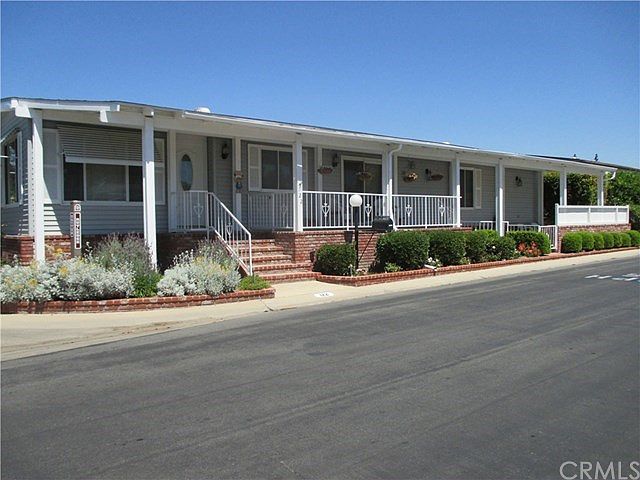 A BEAUTIFUL CORNER HOME - Outstanding curb appeal ! - This upgraded two bedroom, two bathroom home (1,536 sq. ft. - est.) with UPGRADED EXTERIOR SIDING, dual paned windows and slider door, awnings, custom front door, extensive use of brick, large covered front porch patio and lower patio, wrought iron fencing and gate. Living Room and Dining Room area with high ceilings, ceiling fan, venetian blinds. Kitchen with Corian countertops and sink, laminate flooring, recessed lighting, gas stove and opened to the Family Room. Family Room with the sliding door to the covered porch patio. The Master Bedroom is a good size with a whole wall of mirrored wardrobe. The en suite bathroom offers both a stall shower and a bathtub, double sinks (Corian counters) and recessed lighting. The second bedroom has access to the second bathroom. The laundry/ office room with recessed lighting and ample storage cabinets! Two car carport and the custom shed with upgraded siding. Earthquake bracing. Brick steps to the back door. The Groves is a Resident Owned Senior 55+ Mobile Home Park where the sales price includes the home and a share of the corporation that owns the land so NO SPACE RENT! A beautiful community with many activities for the active senior and also a place for those who desire a slower pace. Low maintenance fee - $208/mo. Financing is available.