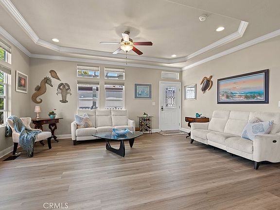 Beautifully appointed Silvercrest- Kingsbury CUSTOM HOME BUILT IN 2014. Extra WIDE 2-Car Garage with 2 Side Doors, and Paid Solar (Southern California Rating is NEM2) Installed in 2023. This beautiful home is located on one of our lush Greenbelts! Featuring 3 Bedroom and 2 Bathrooms. Vinyl Fencing creates a beautiful, large courtyard for entertaining friends and family. Relax on your upper porch overlooking the greenbelt and enjoy lovely sunsets. The entire home has 9' ceilings, stacked vinyl dual pane windows complimented with Custom Graber bottom up/top-down shades. Great Room and Master Bedroom have ceiling trays, recessed lighting and hidden in wall TV hookups. Upgraded kitchen cabinets w/ pull-out drawers in most all lower cabinets, stainless steel appliances with double oven and overhead microwave. Contemporary Custom built in Buffett and Serving area. Large Island and plenty of counter space to work. Laundry in separate room with upgraded built-in cabinets next to Stainless-Steel full-size LG stackable washer/dryer and walk in pantry. All bedrooms are separate from the living area. Master is spacious ready for King size bed. Oversized Master bath, solar tube, corner shower, linen, and private commode area. Walk-in closet features “Elfa" Custom Closet from the Container Store, solar tube provides natural light to closet! Home has recessed lights with LED bulbs and fans in every room. Additional features/upgrades: Life Source whole house water filtration system, NEW light wood color vinyl plank flooring installed 2024 and 5” baseboards and crown molding. All this in The Groves Senior/Resident Owned Community! NO SPACE RENT. Lawn Bowling, Tennis, 7 Acre Park with Putting Green, Horseshoes, Garden Area, Year-round Heated Pool, Gym, Wood Shop, Ceramics, Clubhouse w/ Game Rooms/Pool Tables/Tabletop Shuffleboard, Library, Meeting Rooms, Wifi in Clubhouse, and much more!