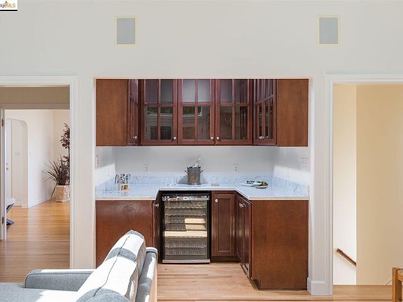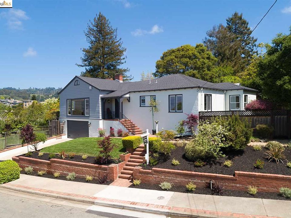 Sited on a corner lot of over ¼ acre, this refreshing Upper Rockridge 3++ bedroom, 3 bath home is filled w/light, comfort & style. Inside, hardwood flooring, open spaces and natural light instantly grab your attention. Imagine intimate conversations as well as large gatherings in the living room with fireplace and picture window overlooking San Francisco and some of the most incredible sunsets in the East Bay. The adjacent formal dining room opens to a deck overlooking the large yard - perfect for indoor/outdoor entertaining. Casual gatherings and summer barbecues are simple and chic in the kitchen/family room combo with island, large pantry, built-in shelving, wine alcove and French doors that lead to the back yard. A verdant oasis all its own, this rare and oversized lot has so much to offer with room for gardening, relaxation, play and room to roam for man's best friend. Don't miss the quaint play house where childhood memories await the lucky new owners.