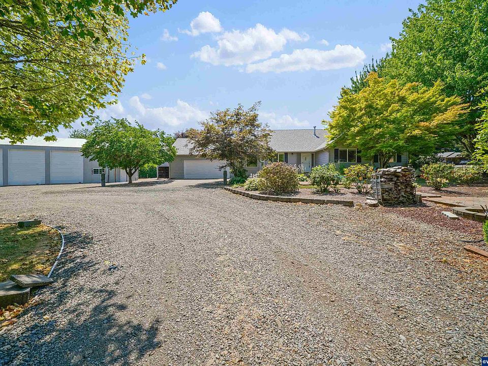 Nestled in a picturesque 1.60-acre setting, this single-story retreat offers serene privacy & ample amenities for Hobbyists & entertainers alike. Featuring a 3 bay shop w/RV storage, & woodshop, alongside solar panels & outbuildings, it caters to practical needs w/efficiency. Enjoy a spacious garden, circular drive, & expansive grounds perfect for pets & play. Whether making memories or hosting gatherings, this property blends charm w/functionality, ideal for those seeking a peaceful yet engaging lifestyle.