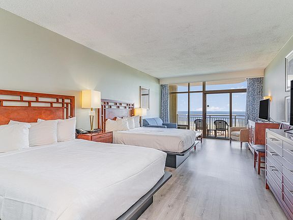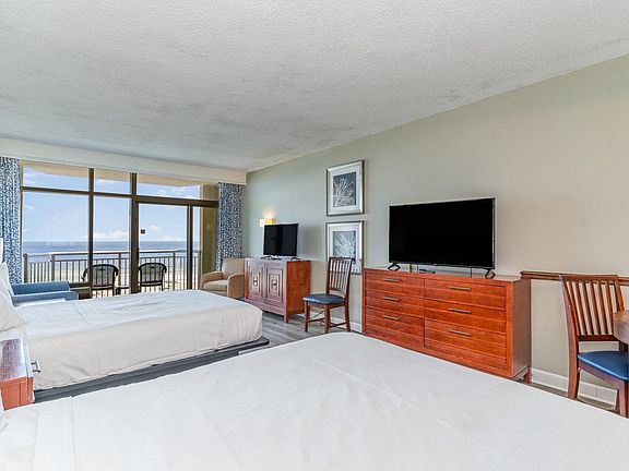 Don't miss this beautiful furnished oceanfront efficiency located in the Palms Tower at the popular Dunes Village Resort! Updated with new flooring in 2024, new HVAC in 2021, new mattresses in 2024 and new bathroom sink in 2023, this unit sleeps six and features a fully equipped galley kitchen with microwave, full size refrigerator, stove and ample cabinet space, two queen beds and a sleep sofa with ocean views, dining table and chairs and bath with tub/shower. Another nice feature is a separate vanity with sink and mirror just off the living/bedroom area. Best of all you can relax on the private balcony with your morning coffee, favorite book or cocktails at end of the day and enjoy the sea breezes and those fantastic ocean views! Dunes Village boasts fabulous amenities which include an incredible indoor water park with a huge pool, multiple water slides, kiddie pools, a hot tub and a 250' lazy river In addition, the resort also offers outdoor pools, an arcade, tennis, volleyball, mini golf, a playground, a year-round activities department, an onsite restaurant, Perk's Up Coffee shop, a fitness center, a Tiki bar and a gift shop. The HOA fee includes water/sewer, electric in the unit, cable, internet and telephone in the unit, as well as building insurance and HO6 contents insurance. Located in the heart of Myrtle Beach and close to shopping, dining, golf, Broadway at the Beach, the Boardwalk, attractions and entertainment. Perfect as an investment property or your dream beach getaway! Schedule your showing today and see why Dunes Resort is one of the top family resorts in Myrtle Beach!