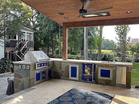 Very rare FINISHED basement home w/fantastic view of Hole 15 green. Completely remodeled, including pool area. Incredible restort-style outdoor "pavilion" with ceiling heaters, cooking area, sink, ice maker, beverage fridge and wood burning fireplace. Downstairs master suite w/ fabulous updated master bath, new lighting throughout, coffered ceilings in great room. Upstairs outdoor porch w/wood burning fireplace with perfect golf course view. Updated kitchen w/Thermador appliances, beverage fridge, seperate icemaker. Cul-de-sac lot and very private pool and spa. Immaculately landscaped. New HVAC. New driveway.