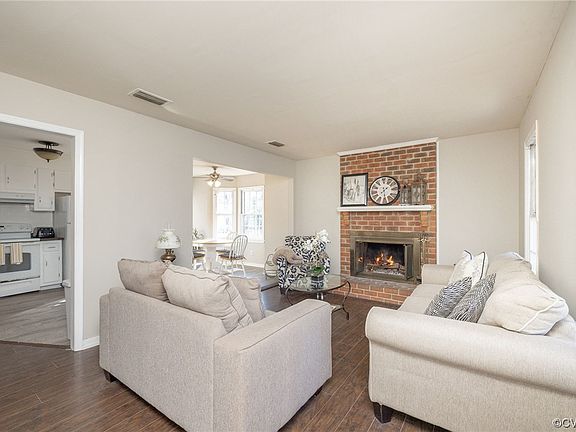 The heart of the home lies in the well-appointed kitchen, featuring ample countertop and cabinet space. Adjacent to the kitchen is the brightly lit dining area, perfect for enjoying family meals or entertaining guests. The living room is a comfortable retreat, complete with a wood burning fireplace, creating a welcoming atmosphere for gatherings during colder months.