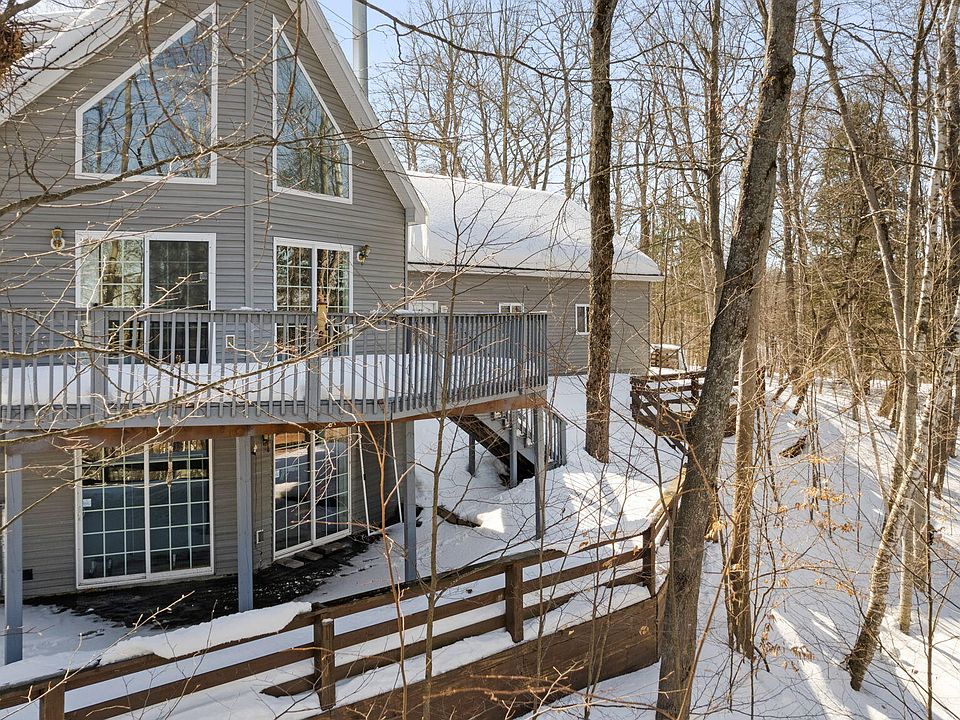 Set on 1.27 acres & adjacent to several acres of HOA property, this spacious prow front chalet boasts, 3 bedrooms, 3 bathrooms, & an additional non-conforming fourth bedroom. The walkout basement with wet bar is completely finished providing a nearly complete mother-in-law suite. Thoughtfully designed open concept with vaulted ceilings & plenty of windows for natural light. Modern finishes include hardwood floors, solid-surface countertops, & custom cabinetry. On those cold winter nights the fireplace provides added warmth & ambiance. When the seasons change the large deck is perfect of entertaining & enjoying the great outdoors. The three-car attached garage allows for indoor parking & additional storage for your toys. Neighborhood amenities include pools & private beach.