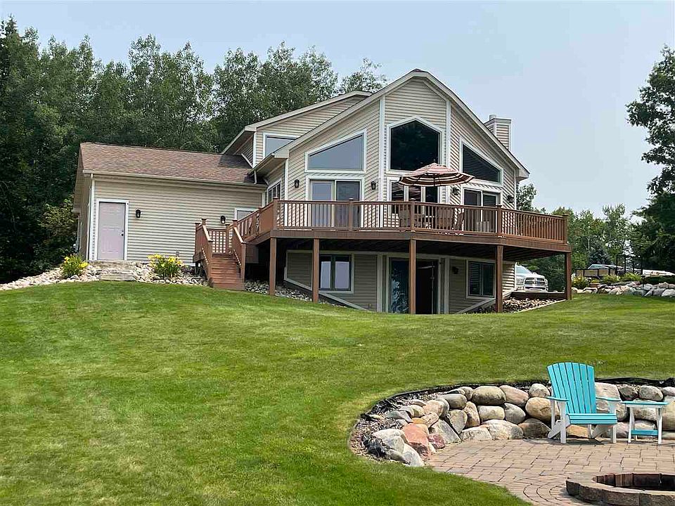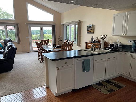 Spacious 4 bdrm, 3-1/2 ba chalet with beautiful view of Lake Lancelot and Island. Wide 122ft water front with a dock plus extension and also includes the floating jet ski doc. Home has as great room with kitchen, dining and living area, gas log fireplace, beautiful wood flooring, corona counters, large deck with 2 French doors. Full bath on each level, ensuite on main level, 2 bedroom up with full bath. Lower level family room is perfect for entertaining and walks out to waterfront. it has a 4th bedroom with egress window, ultility room and wet bar. All new carpeting, freshly painted, new furnace on 10/20, and includes all appliances. (see list of updates with disclosures), exterior has a beautiful brick paver fire pit and conversation area. Ownership provides access to 18 hole championship golf course , pro shop, restaurant/pub, indoor heated pool, exercise center, tennis/bocce ball courts, chalet/sledding hill, walking trails, activity bldg, beaches and more.