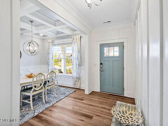 Absolutely stunning turn-key home in the sought-after Fortune Place community in central Wilmington! This barely lived-in home feels brand new and is ready for you to make it your own. Upon entering the foyer, you'll immediately notice the elegant formal dining room adorned with custom lighting, wainscoting and coffered ceilings. The open-concept design effortlessly blends the living area, kitchen, and outdoor porch, making it an ideal space for entertaining. The gourmet kitchen boasts a peninsula island with shiplap accents, a gas range, timeless white cabinetry, and a bright breakfast nook flooded with natural light. The spacious living area features a cozy natural gas fireplace with shiplap accent wall, perfect for relaxing evenings. The luxurious primary suite, located at the rear of the home for added privacy, includes a tray ceiling, a walk-in tiled shower, 2 separate oversized vanities, and a private water closet. Upstairs, you'll find a versatile loft space, three additional bedrooms, and a full bathroom with a double vanity. Step outside to your private, fenced-in backyard complete with a covered porch, perfect for outdoor gatherings. This corner lot provides extra privacy and space. Additional features of this exceptional home include LVP flooring throughout the first floor, crown molding throughout the home, mature landscaping with full irrigation system, blinds, wood tread stairs, and a gas water heater. Situated in Central Wilmington, Fortune Place offers convenient access to local restaurants, a movie theater complex, grocery stores, retail shops, parks, and is just 15 minutes away from Carolina Beach or Wrightsville Beach. Residents of this quiet, centrally located community can enjoy resort-style amenities such as a community pool, clubhouse, sidewalks, and open recreational areas. Don't miss this rare opportunity to own a beautifully maintained, move-in-ready home in Fortune Place!
