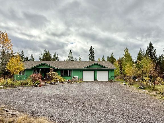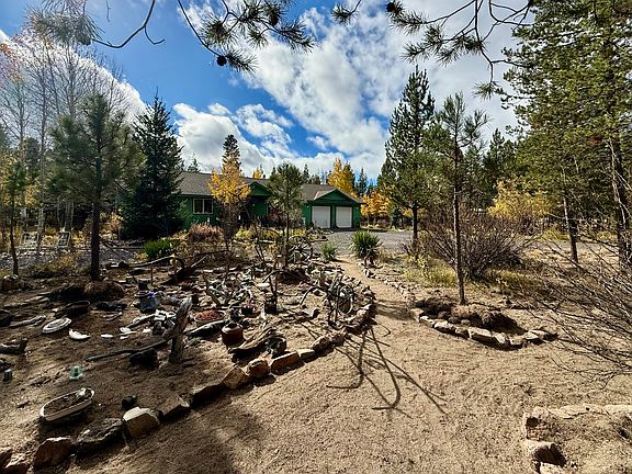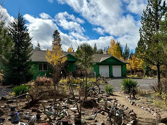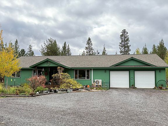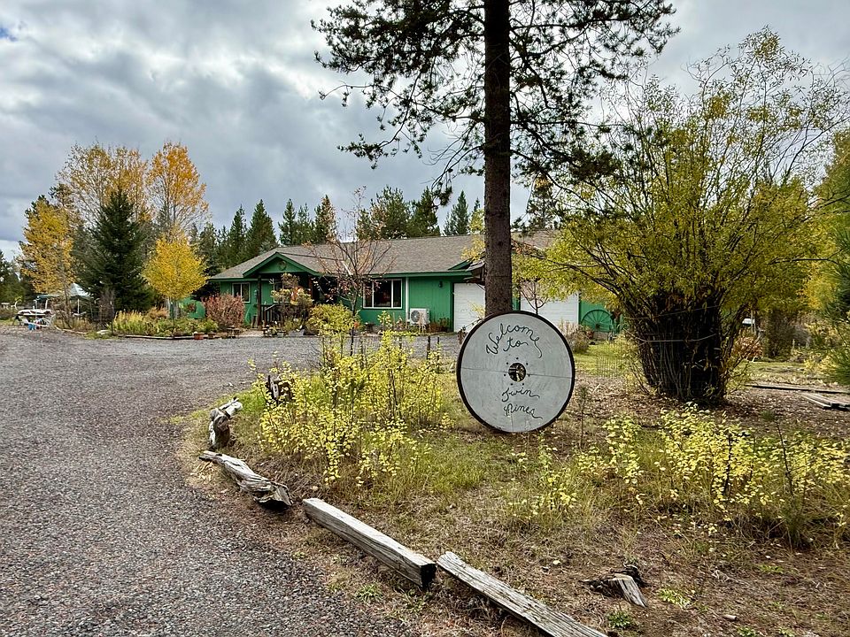 Welcome to your private, fully fenced and gated 2.35-acre sanctuary just 5 miles north of La Pine. Surrounded by towering trees and lots of wildlife, this serene property offers quiet country living with versatile space to match a variety of lifestyles. The main home boasts 2,060 sq. ft. of comfortable living space, including a sunroom addition completed in 2006. The open-concept great room design includes 3 spacious bedrooms, 2 full bathrooms, and a split laundry/office area. A standout feature is the massive 40' x 24' pole barn with 16' tall clearance. The metal-sided garage comfortably fits up to 4 vehicles and includes a 17' x 10' dedicated shop space plus a 720 sq. ft. parking area for two large cars. Also included is a charming 400 sq. ft. cabin that offers potential for conversion into studio or office. Two 120 sq. ft. outbuildings serve as a wood shed and a functional workshop. Outside, enjoy mature apple and plum trees, garden beds, and a cozy 148 sq. ft. front porch.