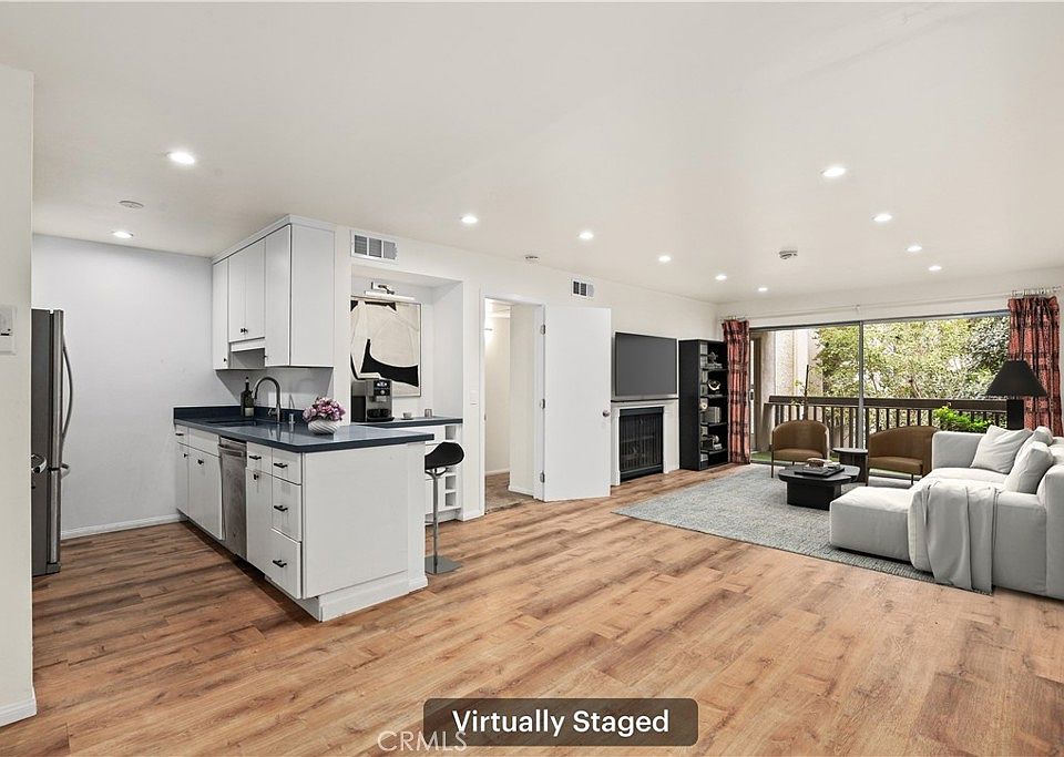 Proud to present this beautifully updated 2 bedroom, 2 bathroom, 1,116 sq ft condo in the highly sought-after Raintree community in Culver City. Thoughtfully renovated with over $80,000 in upgrades in recent years, the home features smooth ceilings, recessed lighting, and engineered wood flooring that elevate the modern appeal. The stylish kitchen is appointed with quartz countertops, a farmhouse sink, stainless steel refrigerator and dishwasher, and an electric stovetop—perfect for everyday cooking and entertaining. The open-concept living room includes a decorative fireplace and flows seamlessly to the extended balcony, surrounded by lush trees and natural light for a peaceful indoor-outdoor experience. Ideal for privacy, the two bedrooms are located on opposite ends of the unit, each with direct balcony access and its own en suite bathroom. The primary suite offers soft carpeting, two sliding-door closets, and a beautifully remodeled bathroom featuring penny tile, modern finishes, and a glass-enclosed shower. The secondary bedroom hosts a walk in closet and adjacent newly tiled bathroom with shower and deep tub. Additional highlights include central heat and air and two assigned parking spaces. HOA includes water, trash, sewer, gas, basic cable and internet. Resort-style living awaits at Raintree, where residents enjoy a wealth of amenities: a heated pool, hot tub, clubhouse, fitness center, scenic walking paths, a large tranquil lake, 24-hour gated security, and even a volleyball court. All of this in the heart of Culver City, just moments from Downtown Culver City, Sony Studios, Baldwin Hills Scenic Overlook, Westfield Mall, countless shops, restaurants, and short distance to two high-ranking elementary schools (Farragut & Linwood E. Howe), Culver City Middle school and Culver City high school.