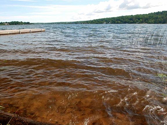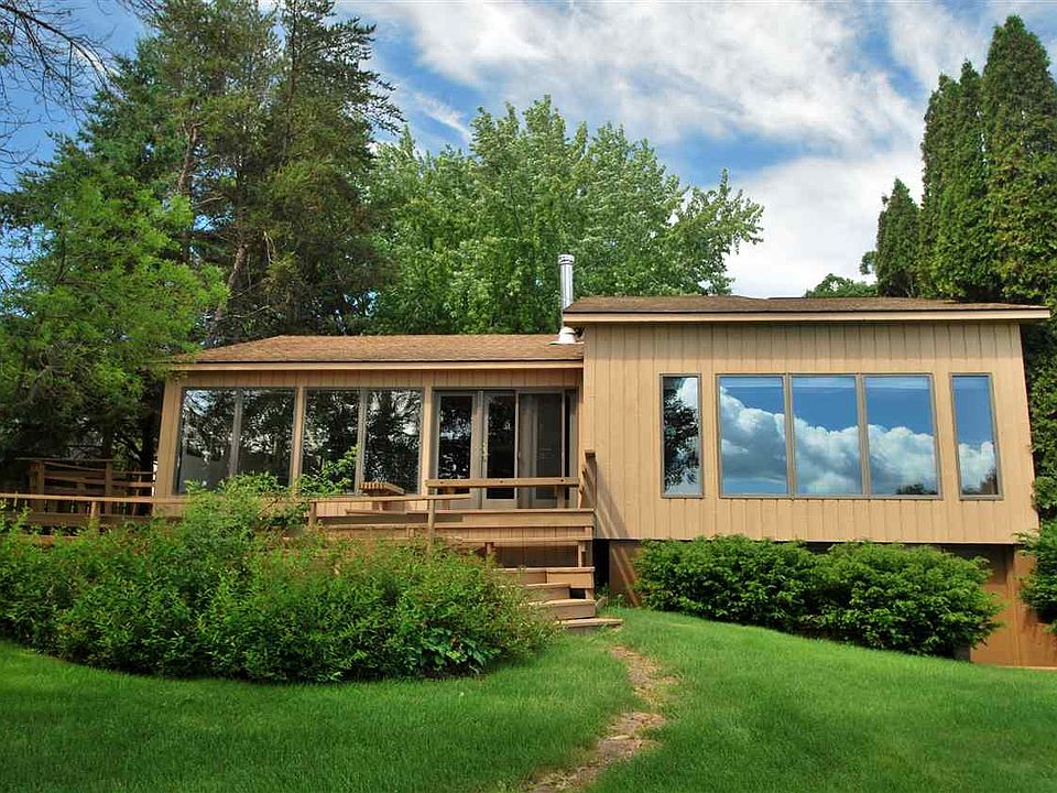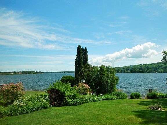 Million dollar views, for much less, from this property: Oscar Bay to Portage Lake. Most of the home was built about 1985. The open floor plan, vaulted ceiling, and window walls in the living/dining/kitchen area take advantage of the waterfront views and the beautiful professionally landscaped lawn with many perennials, and birch trees. An outdoor deck is just outside the dining area. Home is heated by a geothermal system which also provides central air. The lower level is partially exposed; there's a bedroom and a family room in lower level ('train' room in days gone by). The kitchen has a convenient pantry and there are eight closets throughout the house. The main floor bedrooms are separated, providing a bathroom & privacy for each. The loft is listed as an office, but could also serve as a sleeping area. The circular driveway is good for overflow parking. The garage is large enough for at least two cars. There's a dock (not assembled) on the waterfront. Portable dock can be included. Make memories and enjoy the good life on the lake! Some electric bills available-(Feb-July 2017: Heat at 65 degrees: $344 not occupied. 2016:March-Dec -April missing: $219/month avg). 2X6 construction with 1 foam board insulation on house. New control panel on furnace 2014. There is a pump & a system of spigots to draw water from the lake to water the lawn.