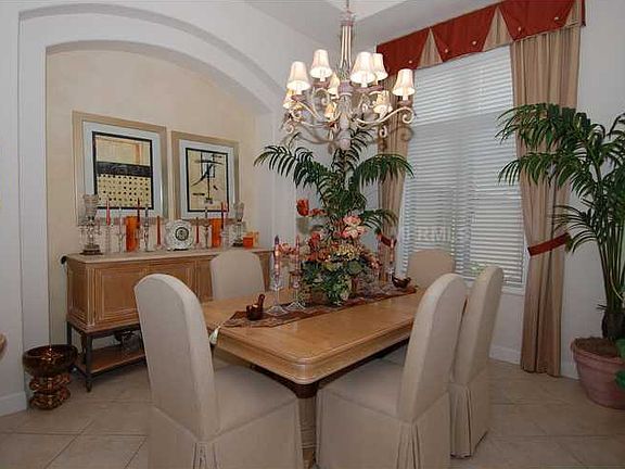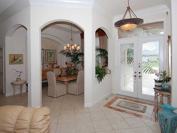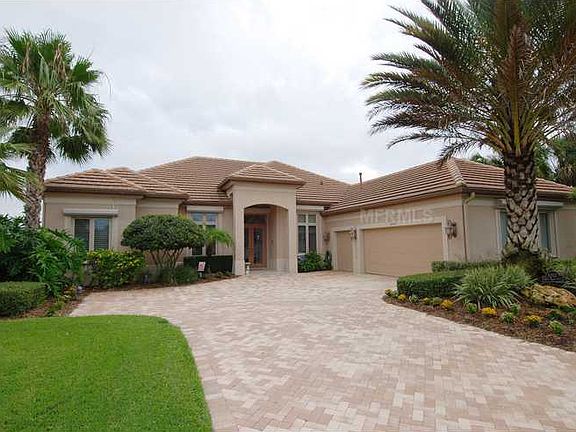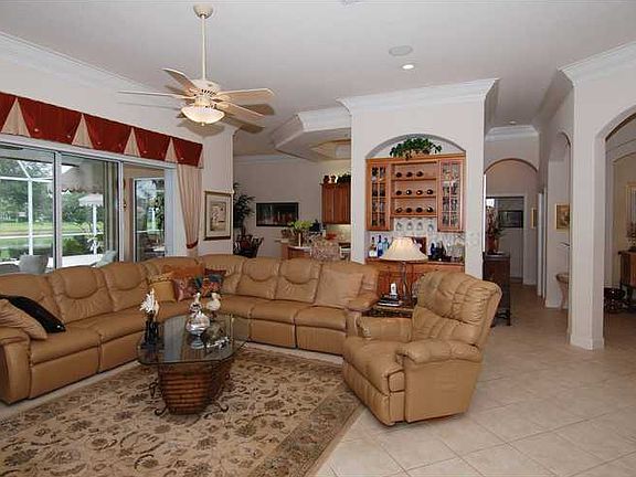 This former model home is deluxe, on a lovely lake view lot, with a 2 car + golf cart side gar, & an A/C bonus room in the garage. The home is loaded with quality extras: lovely cabinetry; built-ins; a separate dining room; triple crown moldings; neutral tile set on the diagonal; tray ceiling; disappearing sliders and built-ins, with wine storage and a dry bar with a granite counter, in the great room; beautiful etched glass front door; surround sound speakers; 3 awnings; a whole house generator; auto roll-down hurricane shutters;. The deluxe kitchen has raised panel wood cabinetry with crown, tile backsplash, smooth top stove, Corian counters and a cafe' area with a bay window. The master bedroom suite includes a large walk-in closet, double sinks, a jetted tub and a Roman shower with tile accents. The extended lanai has a gas and solar heated pool/spa, a handy summer kitchen, with a big party bar, and that spectacular view! Just perfect!!