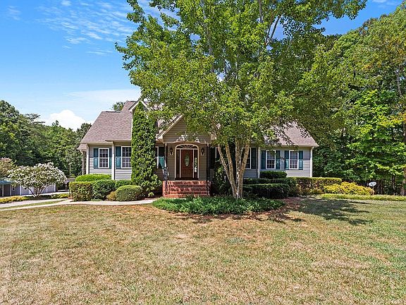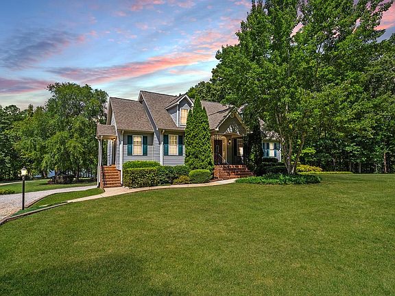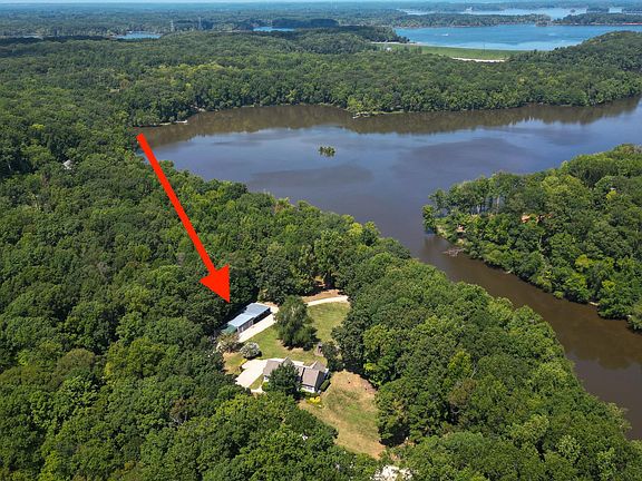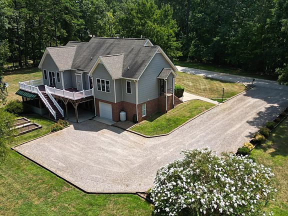 Introducing a private oasis on a 4+ acre lot with private beach access to Island Creek and exclusive boat ramp for 2 lot owners. Enjoy power boating, great fishing, jet skiing and kayaking in the 330 acre reservoir. 1.5 miles to Boat Ramp at Kerr Lake. This home offers valuable livable space, full basement, an oversized deck with lake views, a fire pit, picnic area, personal playground, and garden. Embrace nature's beauty and make lasting memories. Opportunity to own a lake paradise.