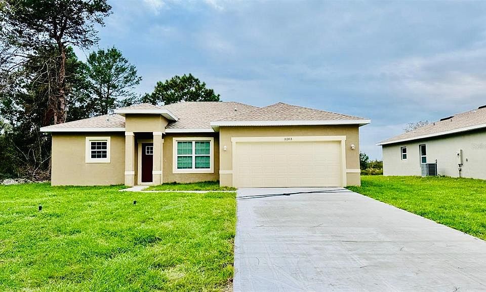 Brand-new house in Ocala! This stunning home combines modern style and convenience with 4 bedrooms and 2.5 bathrooms. The master bathroom is a true retreat, featuring a stunning STANDALONE TUB. The spacious open floor plan is perfect for hosting large family gatherings, and the fully equipped kitchen includes stainless-steel appliances—refrigerator, range, disposal, dishwasher, and microwave. Additional features include a SMART KEY system for enhanced security and convenience. Seller is highly motivated! For a full price, the seller is offering $5,000 towards the buyer's closing costs and SHOWER DOOR! Don’t miss out—schedule a showing today! (Photos refer to the model home.)