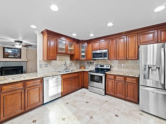 Welcome to this beautiful and tastefully upgraded home, nestled on a cul-de-sac in the heart of the Highland Hills neighborhood! The scenic walkway leads to an entryway, welcoming you to a cozy sitting area with plenty of light. The house flows nicely as you pass through the formal dining room, spacious family room with an inviting fireplace, a full bedroom and a remodeled bathroom featuring granite counter and upgraded vanity, on the first floor, along with a stunning custom, gourmet kitchen featuring; heated floors, ample granite counters, custom cabinets, stainless steel appliances and recessed lighting. Taking the wood railed staircase leads upstairs to an additional 3 bedrooms and 2 baths; the spacious master suite, with ample room for a sitting area by the windows, features a walk in closet, lovely views of the trees and a master bath featuring dual sink vanity, upgraded floor tiles and fresh paint, glass enclosed shower, along with a separate large and inviting tub, to escape and relax in after a long day. The additional bedrooms are ample with plenty of natural light, along with the 2nd bathroom, which features an upgraded dual sink vanity, fresh paint, elegant light fixture, upgraded fixtures, upgraded floor and shower tiles - including built-in shelves in the shower. The large lot provides a private and spacious backyard, which features a stunning heated pool (gated for safety) with plenty of room for chairs to soak up sunshine - serving as a beautiful centerpiece for entertaining! Along with mature fruit trees, large grass area, fresh landscaping, enclosed garden area - all with upgraded sprinkler systems, as well as a side yard with plenty of room for your RV, boat or any storage you may need. Additional home features also include: fully paid off solar panels, central AC/Heating, separate laundry room, ADT alarm and camera system and a 40 amp Solar Edge EV Charger. A short drive to shopping and dining - welcome home to the Highland Hills Neighborhood! Buyer to verify any and all information.