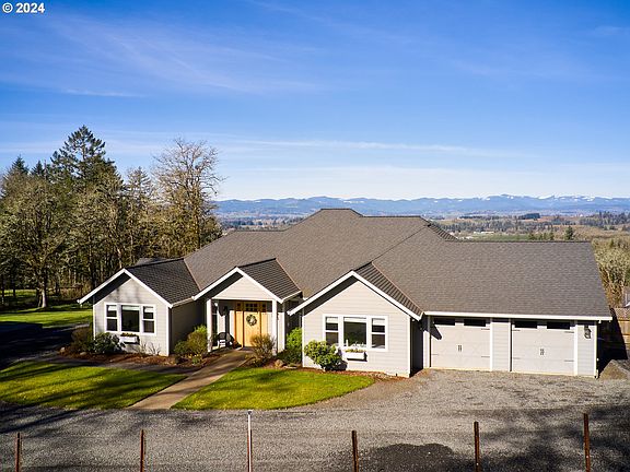 This 5.4-acre custom-built and well-maintained home sits on a dead-end road in the heart of Dundee Hills with access to wineries and dining. Enjoy the valley views and nature from this home's interior. Entertain your guests outside through the French doors on the covered patio with a fireplace and pizza oven. Inside, the oak hardwoods complement the abundant natural light, creating a warm and inviting space. The gourmet kitchen with quartz counters is fully equipped with custom-built cabinets and stainless steel appliances and has an open room layout for the dining and living areas. In addition, built-in features are throughout this stunning home. Enjoy a relaxing dip in your hydrojet tub or in the in-ground and heated pool. Not only are there three full bathrooms, the primary bedroom has a cozy fireplace and a large walk-in shower and closet. Enjoy the large laundry and craft room with custom storage and table. This property offers the perfect escape from the hustle and bustle of life with a hobby vineyard containing 500 Pinot Noir vines surrounded by deer fencing. The 24x36 climate-controlled shop, wine cellar, and quarter bath include Gladiator cabinets and ALL wine-making equipment. In addition to RV parking and RV hook-up, there is ample parking in the oversized, two-car garage and driveway. Both the house and shop have backup power generator connections. Recirculation pump for immediate hot water for all taps in the main house. This property is a hidden gem and represents a rare opportunity to own a peaceful retreat. *All appliances are included.