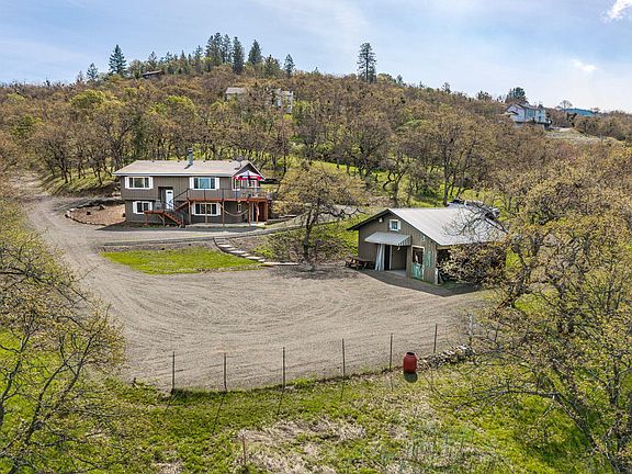 This view property on 6 acres of pasture & oak woodland offers great indoor/outdoor living. The house sits in a private location w/ beautiful valley views. The main flr features an open concept flrplan w/ abundant windows & the living room has a fp & a slider to a large deck. The kitchen has been updated w/ quartz counters, maple cabinets, stainless appliances & a built-in desk. The primary bedrm features a walk-in closet & ensuite bathrm. The lower level includes a utility rm, a large den, laundry rm, & 2 bedrms w/ a full bath. The cedar deck has a custom stainless cable railing & is perfect for entertaining. Below the deck, a patio spa offers a custom sauna, hot tub, & shower. The 1,440 sf barn includes a workshop, utility rm, loft, & storage w/ 240 volt power (EV charger). There is a level pad ready for an ADU, shop or many other uses. This property offers privacy, views & abundant wildlife all while being in a central location close to Ashland, Jacksonville & the Medford airport.