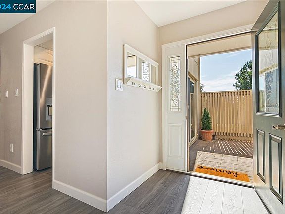 BEAUIFUL END UNIT in coveted Stoneridge Townhomes. This townhouse has been lovingly maintained and updated. Gorgeous chef's kitchen with 2 year old induction stove, wine refrigerator, quartz countertops and plenty of extra cabinet space! Luxury vinyl plank floors are continuous throughout the first floor. New carpet on the stairs, updated bathrooms and spacious bedrooms ensure a move in ready and very comfortable home. The primary bedroom is large enough to add a baby's nursery, office, or seating area. Enjoy a bbq with friends in the very private fenced in backyard with paver terrace and no rear neighbors. Minutes to BART, quick minute to 680, walk to Stoneridge mall. Unit is scheduled to be painted by HOA. This unit will go quickly so please take the time to view it soon!