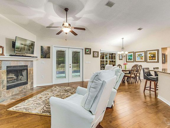 Splash into summer in this move-in ready custom home with your own saltwater sports pool! Expanded and remodeled in 2014 with 3,281 square feet of living space! Plenty of room on over an acre in Santa Rosa County. Easy access to NAS Whiting Field and minutes from the new Publix shopping center. Customized home features a large kitchen with walk-in pantry, granite countertops, and a double oven. Bathrooms have heated floors and primary bath features a beautiful tiled shower. Separate His & Her closets give you tons of storage space! Wood burning fireplace in living room. Extra-large office that could be another bedroom or living room. Screened enclosure off the back encompasses the porch, a gorgeous fiberglass “sports” pool, and an area plumbed for an outdoor kitchen. Pool house or guest suite off the back is perfect for entertaining or would make a fabulous home office, mother-in-law suite, or even could be used as a rental space! 3 car garage features a large, finished shop area. Roof replaced in 2021. Washer and dryer convey. No HOA!