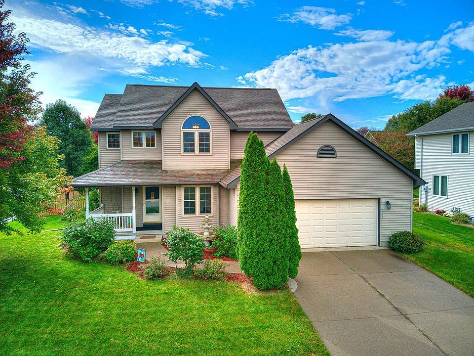 Garage is a two car with a tandem third stall which is great for a vehicle or for extra storage or work area! Quartz kitchen countertops, stainless steel appliances, and interior painting approximately one year ago. Some recent new light fixtures. Sunroom with gas fireplace and skylights is cozy and opens to deck and fenced back yard. Playground equipment and storage shed are included.