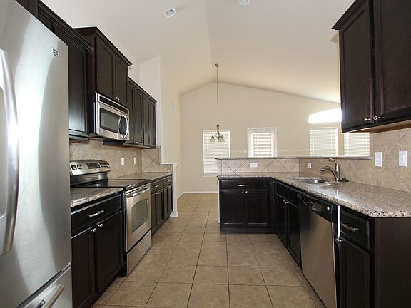 Check out this inviting, four-bedroom, two-bath home located in Killeen with serious curb appeal. Walk-in and be greeted with a tiled entry foyer leading to the open concept living area with high ceilings, Smartcore Laminate flooring, and multiple windows that let in an abundance of natural light. The kitchen features wood cabinetry, stainless steel appliances, including a french door fridge, granite countertops, bartop seating, and plenty of counter and storage space. Adjacent to the kitchen is the breakfast nook, with a beautiful view of the backyard. The spacious master bedroom has large windows, a walk-in closet, and an attached bath with a double vanity, step-in shower, and bathtub. The home is energy efficient and has solar panels installed. The large backyard, which includes a covered patio, is perfect for kids or pets to play or entertain guests! Great location on a quiet cul-de-sac and only 11 minutes from Lions Club Park close to I95 and 4.4 miles from Ft. Hood.