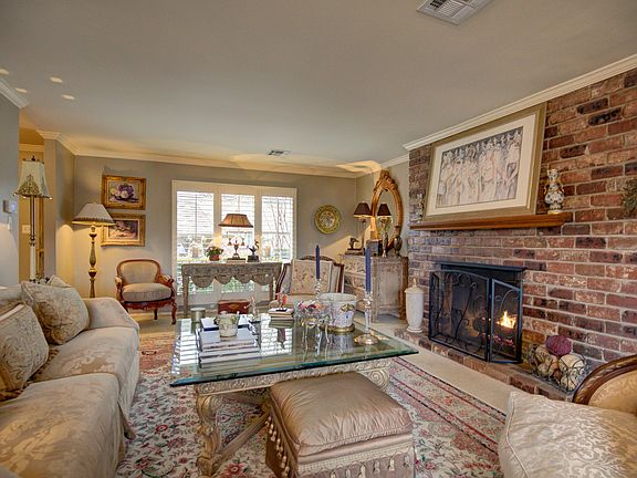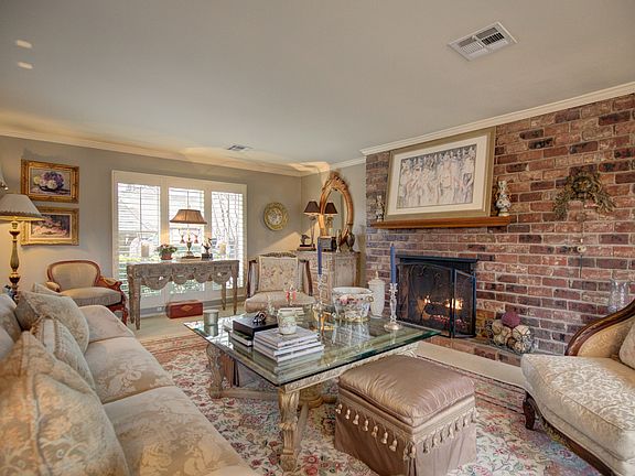 Warm inviting home, beautifully updated! Both baths remodeled with special cabinetry, marble counter tops. Corion counters in kitchen. Gas log fireplace, plantation shutters, wood floors, built in break front. Lovely Trex patio with retractable awning.