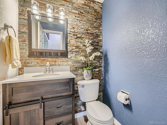 - Description: Private Powder Bath With Beautiful Stone Accent Wall And Updated Vanity