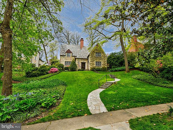 MULTIPLE OFFERS RECEIVED. OFFER DEADLINE 1/19 9PM.  Curb appeal to the max! Storybook charming Palmer Lamdin stone & brick French cottage perched on a hill just above the Homeland Lakes. Three spacious bedrooms plus an office/den or 4th bedroom, 2.5 bathrooms. Living room with custom built-ins and oversized wood burning fireplace. Primary bedroom with spacious dressing room contains washer & dryer, making laundry a breeze! Extensive rear hardscaping with two tier bluestone patio is an entertainers dream. Two car garage plus a two car parking pad. Additional washer dryer and tons of storage space in unfinished lower level. Fully updated and ready to move right in. This one won't last!