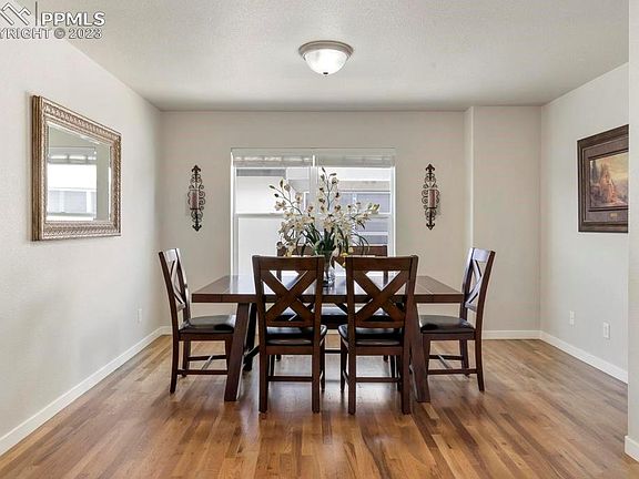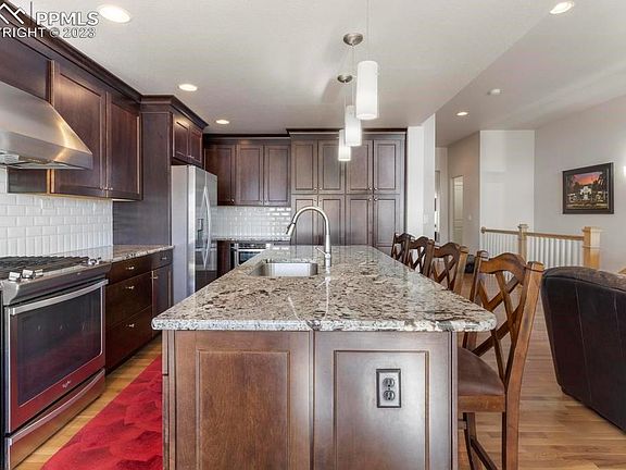 ***NEW ROOF*** The Seller is the original owner and this is the first time this stunning rancher is being made available! Located on a cul-de-sac near the schools and Community Center, this lot provides a walk-out basement and stunning mountain views! It gets better on the inside. Wood Floors spread throughout the Main Level Living Areas, large windows take in the beautiful Colorado views, and the Main Level has the Primary Suite as well as a Guest Bedroom and Bathroom! The Formal Dining Room is large while the Eat-in Gourmet Kitchen allows for more intimate dining. The Granite Slab Counters in the Kitchen are also featured on the enormous Island, which offers additional bar seating! Stainless Steel Appliances, Microwave Drawer, Vent Hood, Tile Backsplash, and the 5-burner Gas Range all remind the chef that this Kitchen provides a Gourmet Experience! The Living Room has a Gas Fireplace with Stone Surround and is framed by Built-in Shelves. You can BBQ on the Covered Deck or walk down into the backyard for more privacy, all while enjoying the views of Pikes Peak and The Front Range. The Primary Suite enjoys Quartz Counters with tile backsplash up to the ceiling! The Oversized Shower features large tiles, a bench, and a mud-set pan so you feel like you’re in a spa. The Basement was upgraded to include 9’ ceilings and finished with 2 more Bedrooms, an additional Full Bathroom, an area for a Home Gym, and an area for an Office. Walkout to the covered patio to enjoy your fully-landscaped and fenced back yard! The Family Room and Living Room are both prewired for speakers! The Cordera Community Center is within walking distance and offers a Club House, Pool, Event Lawn, and a great gathering place to meet your neighbors or bring your friends. Schedule a tour before this beauty sells!