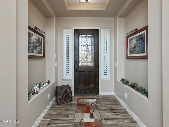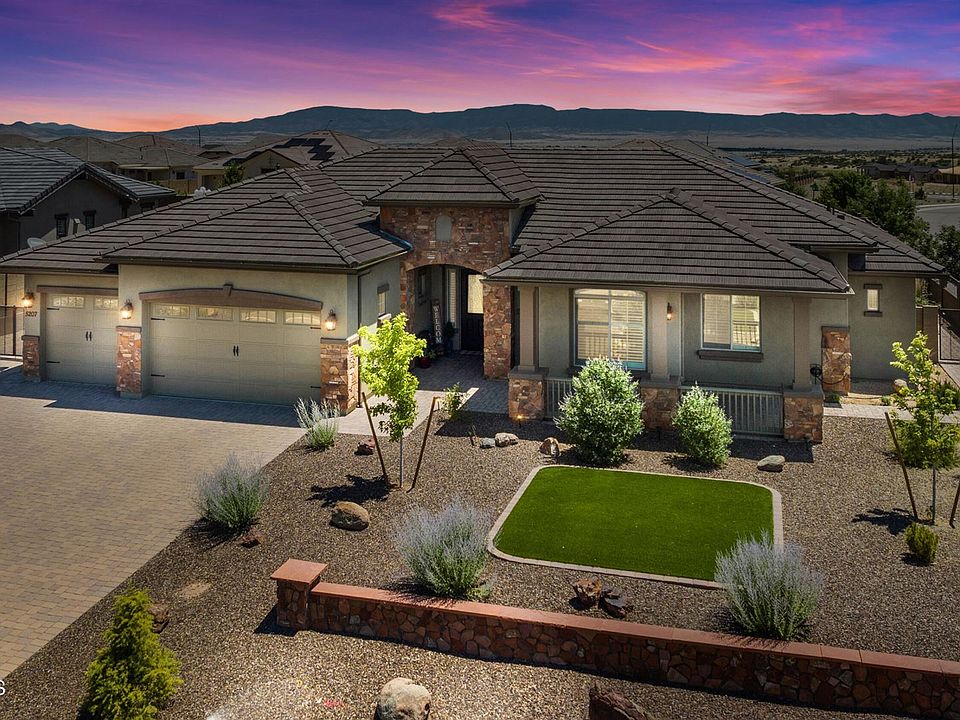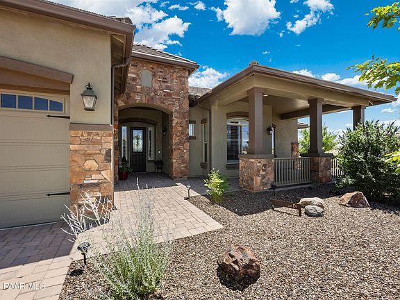 Stunning home in the popular Granite Dells. Welcoming and spacious 2341 sf home offering 3 bedrooms/2 baths with warm cabinetry, wood look tile in the main living areas, large great room, plantation shutters throughout, whole house fan, huge gourmet kitchen to include a wine frig, pantry, eat in area plus a formal dining room. The oversized 3.5 garage features built in cabinetry, a workspace area and epoxy floors. For the entertainer, enjoy the indoor outdoor sound system and park like backyard featuring a beautiful rock fountain, firepit and fruit trees. Spacious outdoor seating areas to enjoy the perfect Prescott weather. A bonus is the gated RV parking pad at the side of the home. This home has been lightly lived in and is ready for you to call home.