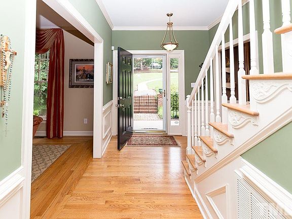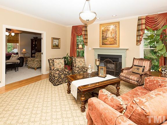 Fabulous home on cul-de-sac w/ wooded lot! Like living at a country retreat right here - close to 540, Brier Creek, RTP. Five star commercial gas range w/griddle, country sink, granite, tile backsplash, butcher block island, wet bar w/wine cooler. New CARPET & ROOF! Newer hot water heater and TRANE A/C units. Hardwoods throughout main floor and along hallway upstairs. Prof. Landscaped w/fire pit and landscape lights, deck and stone patio. Wired workshop located in walk in crawlspace. No city taxes!!