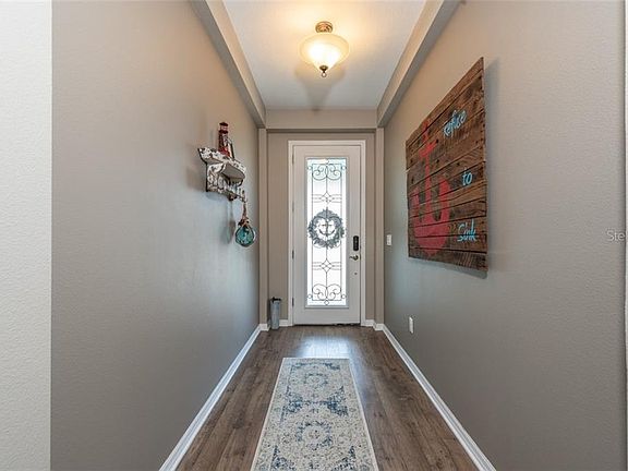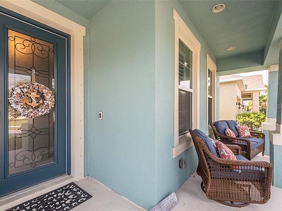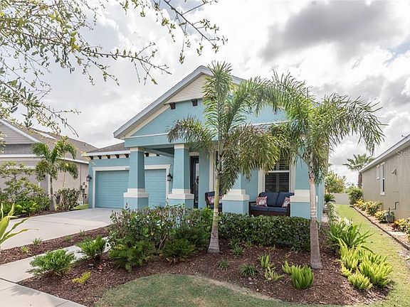 This MiraBay home shouts "Florida" as soon as you pull up with its craftsman style, cozy front porch, and exterior painted a beautiful shade of teal. This nearly new, Cal-Atlantic home built in 2017 features 2100+ sq feet, an open-concept floor plan, a custom "WOW" kitchen, separate dining, breakfast, and family rooms, a 2-way split with 3 bedrooms, two baths, 9'4" foot ceilings, energy-efficient windows, plantations blinds, hurricane shutters, engineered hardwood laminate flooring, upgraded fixtures and lighting, screened lanai and a 2-car garage (20'x21') with additional storage space in the attic. The custom kitchen is a chef's or baker's dream come true and great for entertaining. It boasts 42" cabinets, a gas stove with 5 burners and a convection oven, upgraded granite countertops, a 14' x 4' extended one-level island with breakfast bar with room for 8 chairs, stainless steel appliances, tiled backsplash, wall pantry, pull-out shelves, and a one of a kind custom wood range hood. The family room showcases a tray ceiling, a gas line for a fireplace and a triple-stacking sliding glass doors that lead to your screened rear lanai (13'x8') with a gas line for the barbecue. The owners' suite (14'x17') offers a large walk-in closet, and en-suite featuring a garden tub, a separate frameless glass enclosed shower, and granite double sinks. The spacious secondary bedrooms share a bath. Don't miss your chance to enjoy the waterfront-lifestyle community of Admiral Pointe at MiraBay! As a resident of this gated resort-style coastal community, you'll feel like you're on vacation everyday with amazing amenities, including a massive resort style zero entry pool with water features and heated lap pool. Five, lit, hard-true tennis courts, pickleball, basketball, parks and playgrounds, an extensive modern gym with machines and free weights, Spa, Café, Fishing Pier, and full Outfitter offering Kayaks & Canoes with access to the Bay through the beautiful lagoon. Minutes to schools, shopping, hospitals, and restaurants. Takes about an hour to Tampa International Airport, downtown Tampa, St Petersburg and Clearwater. Little over an hour to Orlando and Sarasota. Sound like a great place for your new home? Call today for your private showing!
