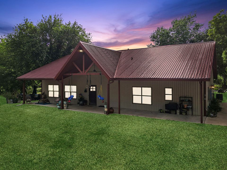 Welcome to your private paradise that allows you to get away from it all while being close to everything you need! Step onto the 4 private acres of rolling hills and lush greenery with tranquil views from every window in the house. This family home is oriented in the heart of the woods, with a custom glass roll up door that brings the beauty of the heavily treed acreage right into your living area. Open, versatile floor plan designed for living your best life, with meticulous attention to detail throughout the home, including hand painted walls, abundant natural light, and a layout that will work for even the most discerning of buyers. Enjoy the full covered porch, the pond, the apple, pear, plum, peach, and pecan trees, plus plump blackberries growing on the property. Water and power are available throughout the acreage to give you endless possibilities. Set up for multi-generational living, with two owner suites, a site for an RV with electrical and water hook- ups.