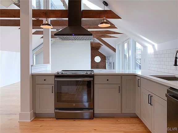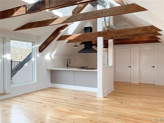 This handsome brick structure was originally a Granary, built and used by Fank C. Williams as a warehouse/rail depot for his flour milling operations along the Bushkill. Once a major grain & produce center, the property now has a stunning adaptive re-use as condos. This bright penthouse showcases original wood beams & warm exposed brick. Vast skylights allow an abundance of natural light to flow through to the main living area; feels like you are floating. Full bath equipped with double vanity, soaking tub & walk-in shower. Kitchen is open to living space; features fine fixtures, cabinetry and quartz counters. One of the most unique living experiences in town, with its own private eagles nest balcony with views of Bushkill Creek, Silk Mill & distant hills above the Karl Stirner Arts Trail. Owners will enjoy KOZ & LERTA tax advantages. Just a scenic stroll or bike ride away to downtown Easton, and the Silk Mill; there's no place like THIS home, in such a connected and commutable spot.