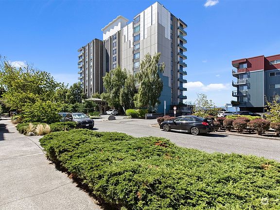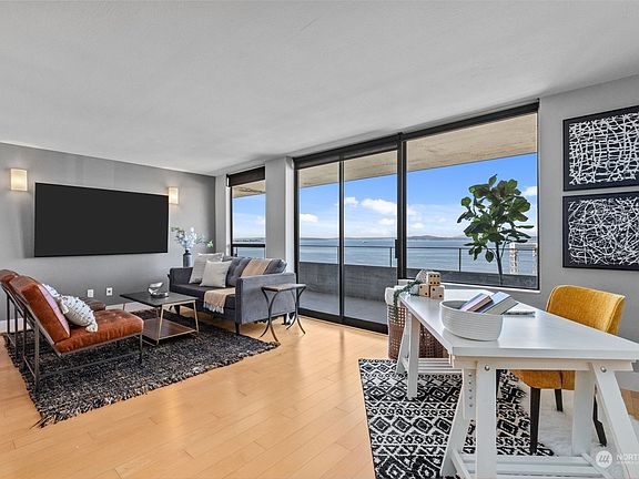 Breathtaking water and mountain views from this rarely available unit in the Lower Queen Anne @Harbor House. Spacious 2 bed/ 2 bath. Primary has slider with access to patio + En suite bathroom! Open living area, laminate flooring, new carpet, recently painted, covered 46' long deck to relax. Stellar 180* degree views of Sound, mountain & islands from all living areas.Secure building w lobby entrance, 1 parking space in garage. Tons of storage! Just moments away from coffee shops, restaurants, Climate Pledge Arena and so much more!