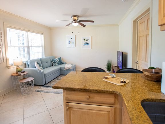 Your own piece of paradise, one block from Upham Beach with a pool! This is a 1st floor - 1 bedroom/1 bath apartment with a patio! 9-Unit apartment complex located just a block away from Upham Beach Park! Blue Skies is a small, quiet apartment complex with 9 units total. This unit has tile floors throughout, and granite countertops in the kitchen and bath. Kitchen has lots of cabinets for plenty of storage as well as full size appliances including microwave and dishwasher. Unit has big windows to allow for tons of natural light, central heat and air, corner unit and coin laundry facility on site. Pool has lots of seating, mature palm trees that provide great shade and has a BBQ grill Rent includes water/sewer/trash, landscaping, pool access AND one reserved off street parking spot. Pets negotiable. Renter's Insurance required. 600+ Credit, No delinquent tenant or eviction. Proof of Income 2.5x rent. Utilities included: garbage, water & internet . No smoking. Cleaning Fee - $150.00