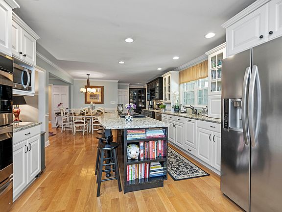 This home offers a partial basement with a wet bar and full bath, perfect for hosting gatherings. There are three additional bedrooms and two more full baths, providing ample space for guests. The family room is a cozy haven with built-in bookshelves and a fireplace. Hardwood floors run throughout the home - no carpet in sight.