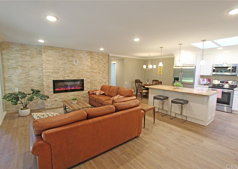 This beautiful turnkey home is perched above Serpentine Walk, which is one of the most amazing green belts in Laguna Woods. The moment you walk through the front door your eyes will be drawn to the stunning view. The earth tone color pallete and abundance of natural light help to complete the park-like setting of this home. At 1,040 square feet, this charming property offers two bedrooms, and two complete bathrooms. It was fully remodeled one year ago, and features an open floor plan, designer gourmet kitchen with stainless steel appliances, Kolville cabinets with soft close doors and drawers, over-sized kitchen island with seating for four people, a large skylight, new vinyl waterproof wood-like flooring and the incredible travertine ledger stone living room wall with LED fireplace! For your convenience a stack GE washer/dryer has been built-in to the hall closet. The finishing touches are LED can lighting, BRAND NEW double pane vinyl windows and sliding glass door, new doors throughout the home, and beautiful crown molding and baseboards. Parking can be an issue in Laguna Woods, but this cul du sac boosts ample guest parking (always available), and is a short stroll from clubhouse 3 and the post office. Laguna Woods Village is the premier active 55+ communities in Orange County, and offers all of our residents an incredible resort-like lifestyle. You'll definitely want to see this home before it gone!