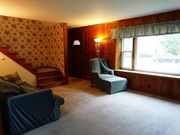 Charming 2 story home! Open concept living rm w/knotty pine walls & cozy FP, formal dining area w/snack bar & adjacent to applianced kitchen w/new flooring. Upper master bedroom w/hardwood floor & 2 closets. Main & upper level baths. 1st floor laundry complete w/washer & dryer. Extensive list of updates. Beautifully landscaped setting w/brick patio, storage shed, arbor & gardens! 1.5 car att gar.