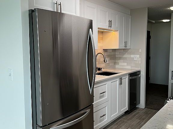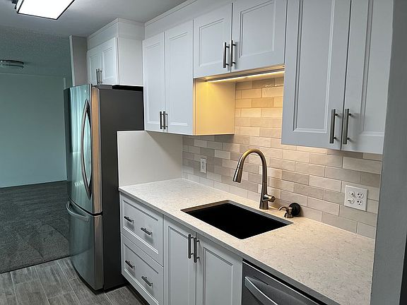 New sink, garbage disposal, modern cabinets and quartz counters.
