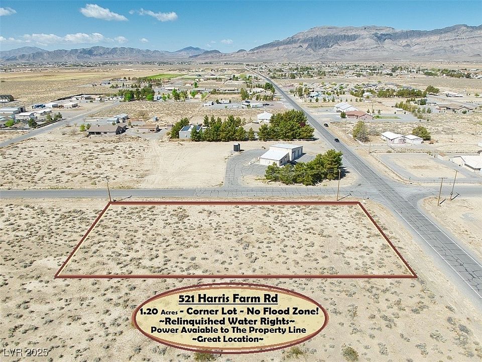 Welcome to 521 Harris Farm Road~1.20-acre Corner Lot, offering Relinquished Water Rights and Power conveniently available at the property line for easier meter connection. This exceptional parcel is Out of a Flood Zone! Breathtaking Mountain Views! Located in a peaceful and rapidly growing community, this property provides easy access to Hwy 160, making it perfect for those seeking a serene escape without sacrificing city convenience. Don’t let this rare opportunity slip away—secure your piece of Pahrump today!