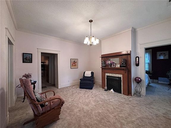 Inside, oversized rooms give this home a grand feel. There are two parlors, each with its own fireplace (one decorative, one in the eat-in kitchen), plus a spacious dining room with a custom built-in cabinet. The home offers three bedrooms and a full bath, with the master bedroom being exceptionally large. Main-floor laundry and plenty of cabinetry add convenience.